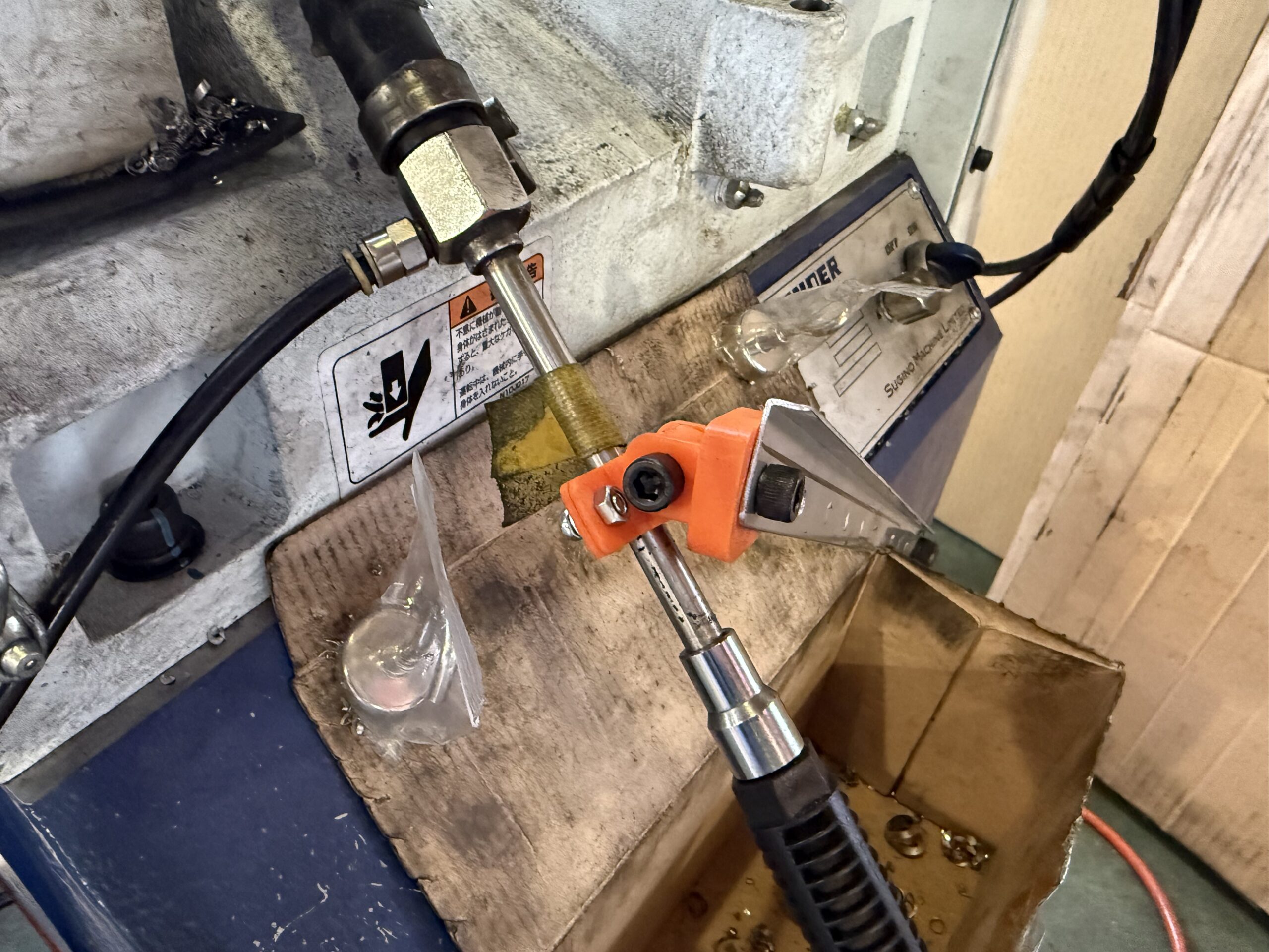 3Dプリンター活用事例 エアーノズルホルダー/3Dプリンター 2025.12.18 この記事のタイトルとURLをコピーする 面取り加工機ニューエンダにエアーノズルを取り付けるための部品を製作しました。 もちろん金属で作ることもできるのですが、3Dプリンタであれば 設計が終わった段階であとは3Dプリンタが作ってくれるのでとてもスムーズです。 丸形状などクランプで取り付けにくい工具など 取り付ける際のパーツ作成に有効な選択肢だと思います。 首を振れるようになっているのでエアーをかけたい位置を狙うのも簡単です。